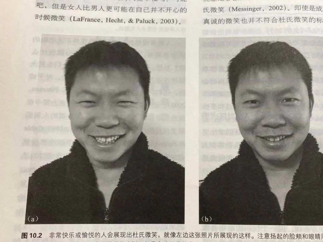 我们的笑容,其实有两种,一种是真笑,另外一种是社交型的笑,那问题来了,怎么对这两种加以区分呢? 《情绪心理学》这本书提到这样的一个方法:提升的脸颊、眼角出现细纹,嘴巴会提升。(下图左边就是真笑,右边就是社交型的笑)