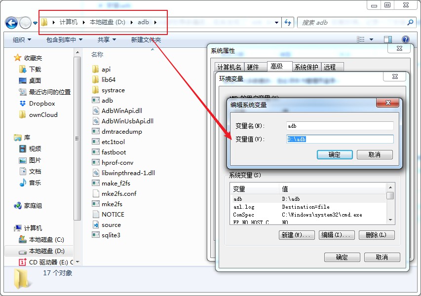 然后修改环境变量,在末尾加上 ;%adb%; ,保存 :
